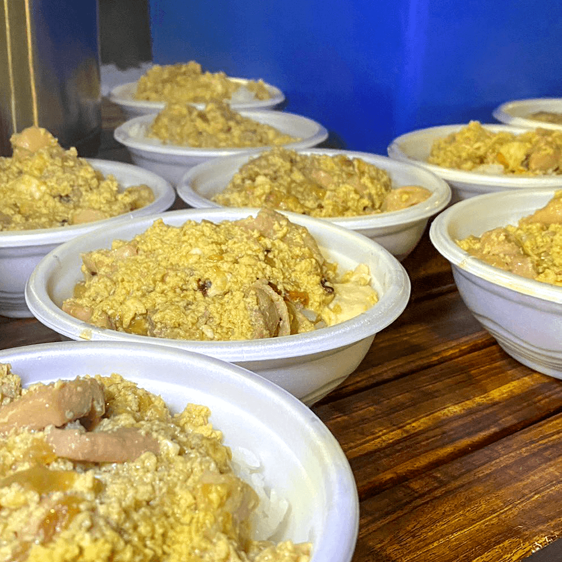 たっぷりの鶏肉を煮込んで旨みが詰まった出汁を味付けた炊き出しの大量調理でこその旨みの強い親子丼が出来上がりました!